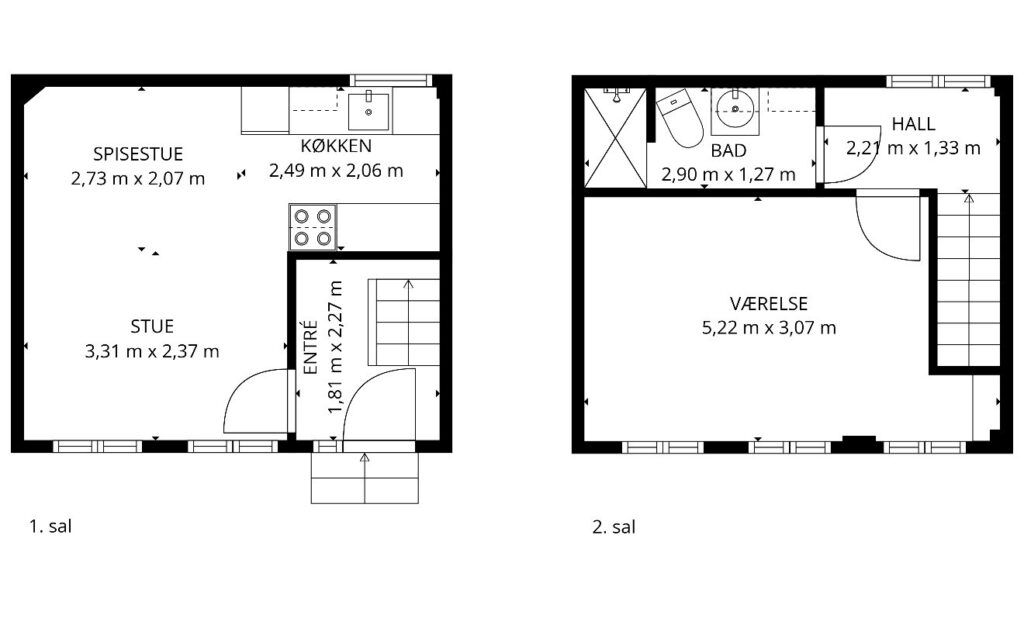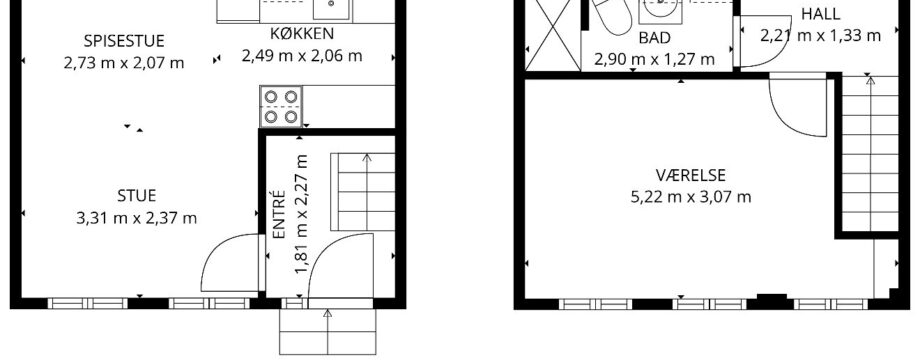 Huset er på to plan med stue/køkken i stueplan og soveværelse og badeværelse på 1. sal.